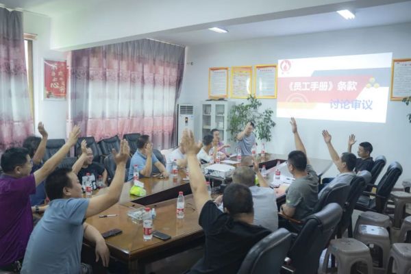 會議環(huán)節(jié),安環(huán)委主任通篇朗讀新版《員工手冊》安全管理?xiàng)l款,公司各部門中層及以上管理人員共同討論審議,舉手表決,全票通過。新版《員工手冊》將于2023年7月在朝陽集團(tuán)正式啟用執(zhí)行。